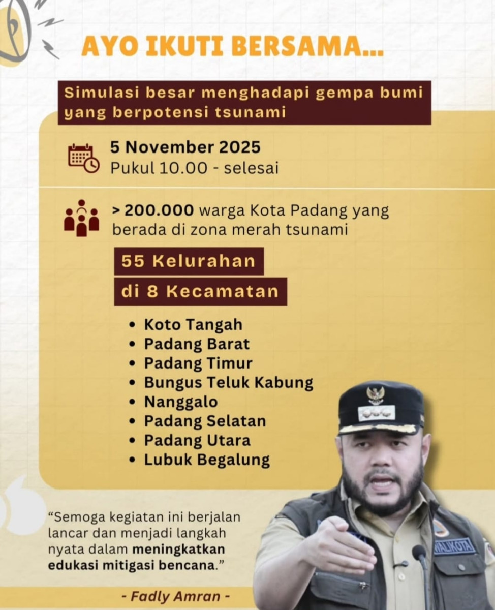 “Pemerintah daerah perlu rutin menggelar simulasi agar masyarakat paham langkah penyelamatan,” kata Rustian kepada wartawan di Padang, Senin (27/10/2025).